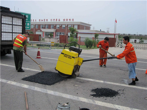 施工工藝包括: ①劃定維修范圍。形狀按照圓洞方補原則,使維修面成矩形,四周同路面標線平行或垂直;根據(jù)表面病害實際范圍向四周擴大 30 cm。②鑿除病害面層。利用切縫機、液壓鎬等設(shè)備鑿除維修范圍內(nèi)的瀝青砼,當處理層次超過一層時,要分層鑿除,各層的鑿除面要形成臺階(臺階寬度不小于 10 cm) 。③處理鑿除面。及時處理坑槽底面病害及坑槽內(nèi)松散料,當坑槽內(nèi)有水時,用干布吸干,盡量不要殘留流動水(可以潮濕) 。④填放冷料,分層碾壓。為了保證效果, 冷補材料均要求分薄層攤鋪夯實,一般按 2~3 cm厚度進行分層鋪筑,然后用小型平板夯配合小型手扶式鋼輪壓路機壓實,必要時用小榔頭對周邊進行斜側(cè)向夯擊。